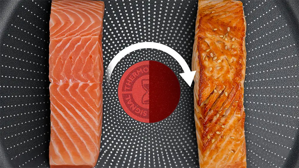 Tefal's signature Thermo-Signal™ temperature indicator is the key to perfect texture and colour. The Thermo-Signal™ turns solid red when the pan is perfectly preheated and ready to cook.