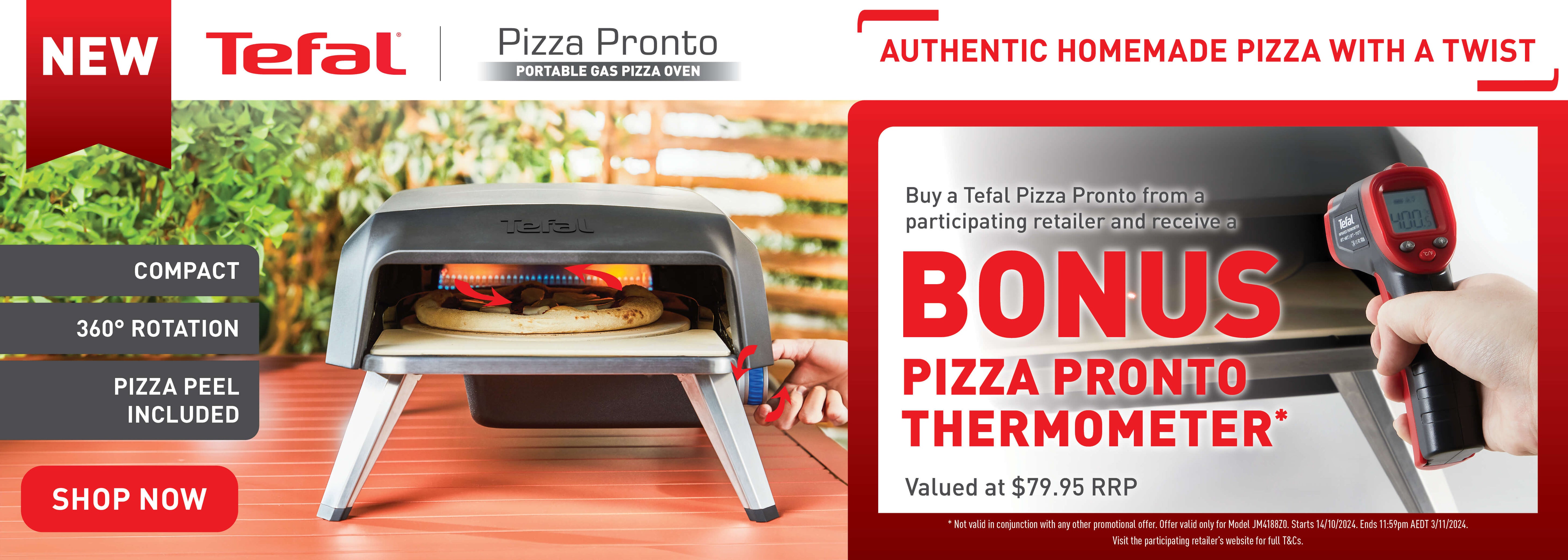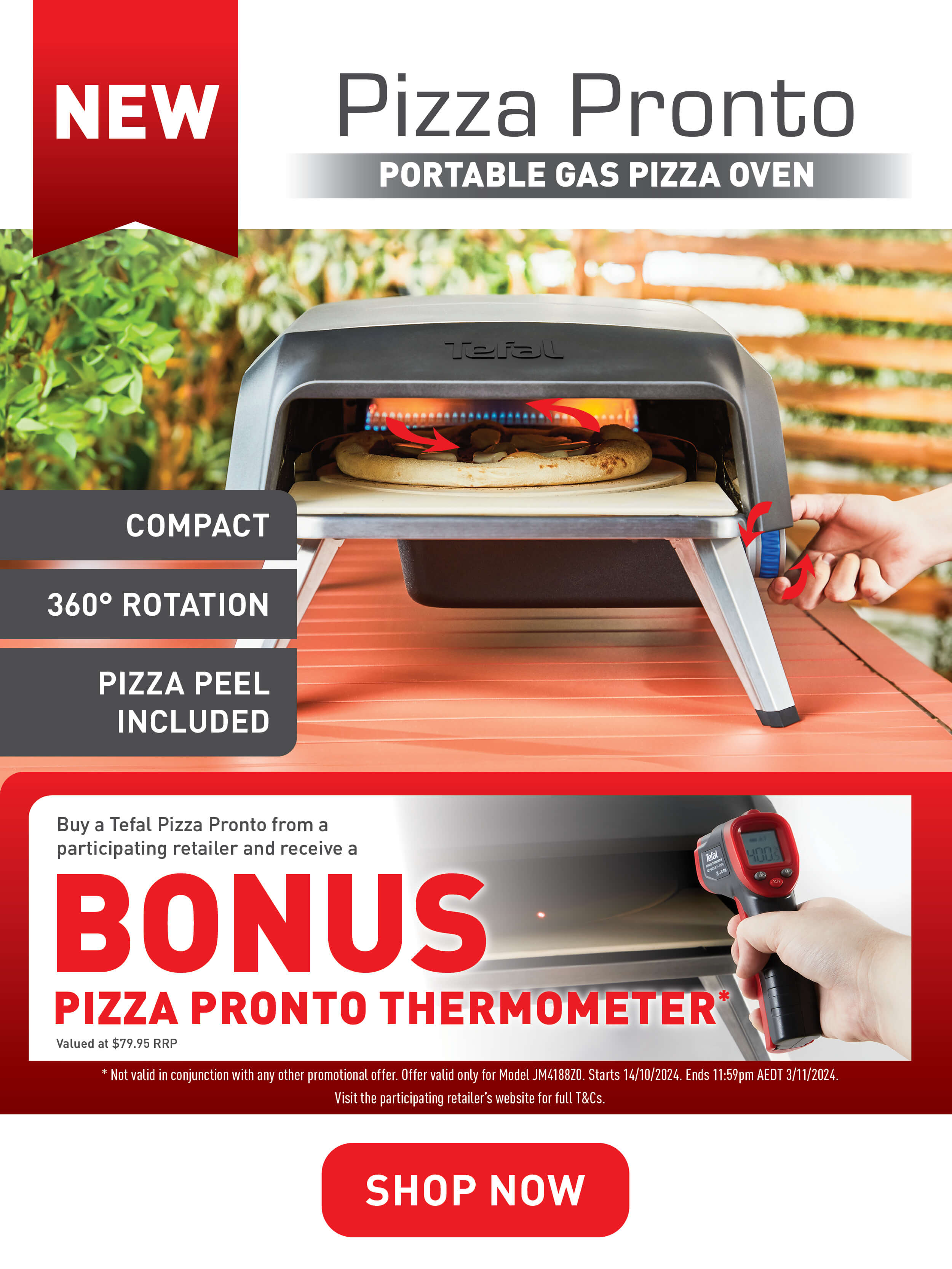 Purchase a Tefal Pizza Pronto Outdoor Gas Pizza Oven JM4188 between 14/10/2024 and 3/11/2024 at a participating retailer and receive a BONUS Tefal Pizza Pronto Infrared Thermometer valued at $79.95. While stocks last.