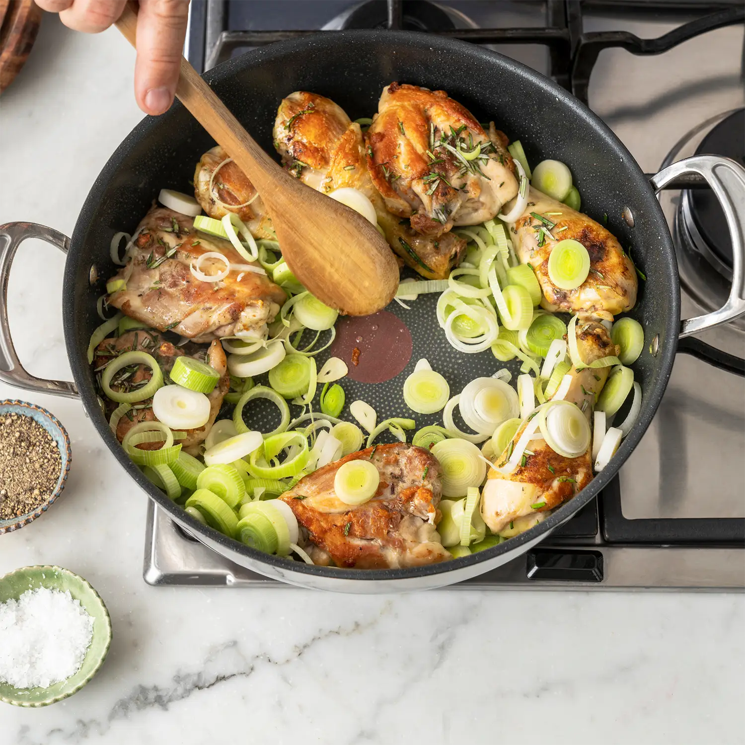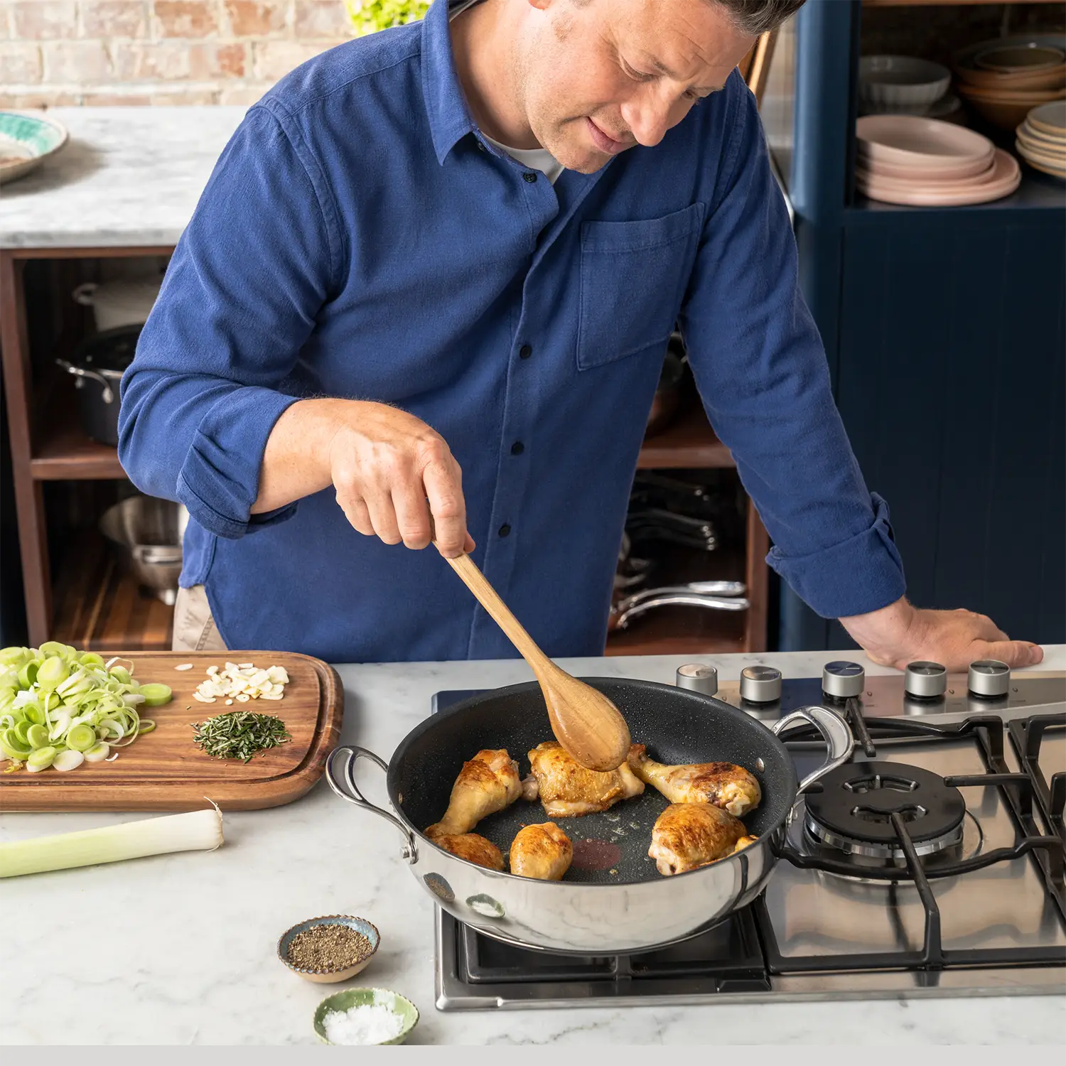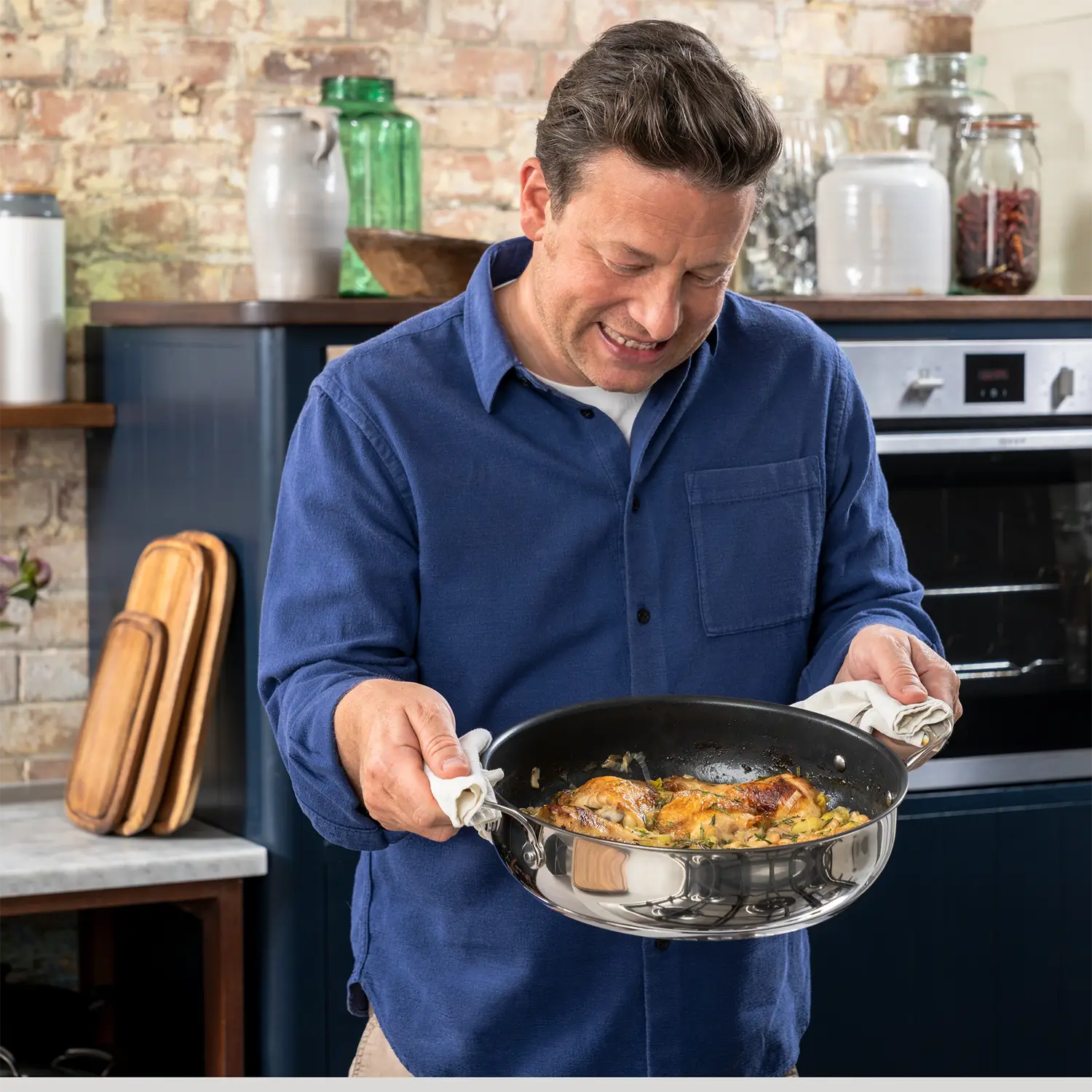 Stylish stainless steel is perfect for hob-to-table dining, as it looks as good as it cooks. Not only is the pan non-stick, it's super-durable, taking any knocks in its stride, and making cooking even more enjoyable. Designed by Jamie Oliver: “This pot is the one I couldn’t do without. It’s so versatile – it’s my absolute favourite. I use it for everything, from curries and ragùs on the hob to slow-cooked lamb shanks or a tasty chicken stew in the oven.”
