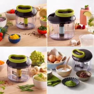 Attach the blade. Add your ingredient. Close the lid. Pull the handle… One, two, three times. The more you pull, the finer you chop!