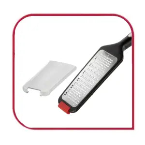 The stainless steel grater is equipped with a blade guard to ensure safe storage for the whole family
