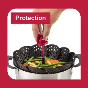 From steaming sliced vegetables to dumplings and fish fillets, the Tefal Ingenio Premium Steamer Basket promises optimal ease of use thanks to a self-adjusting design with the perfect fit for any cookware. Foldable for easy storage and heat-resistant up to 230°C, this durable kitchen accessory is made of high-quality materials that are built to last. A finger guard to keep hands safe completes the package.