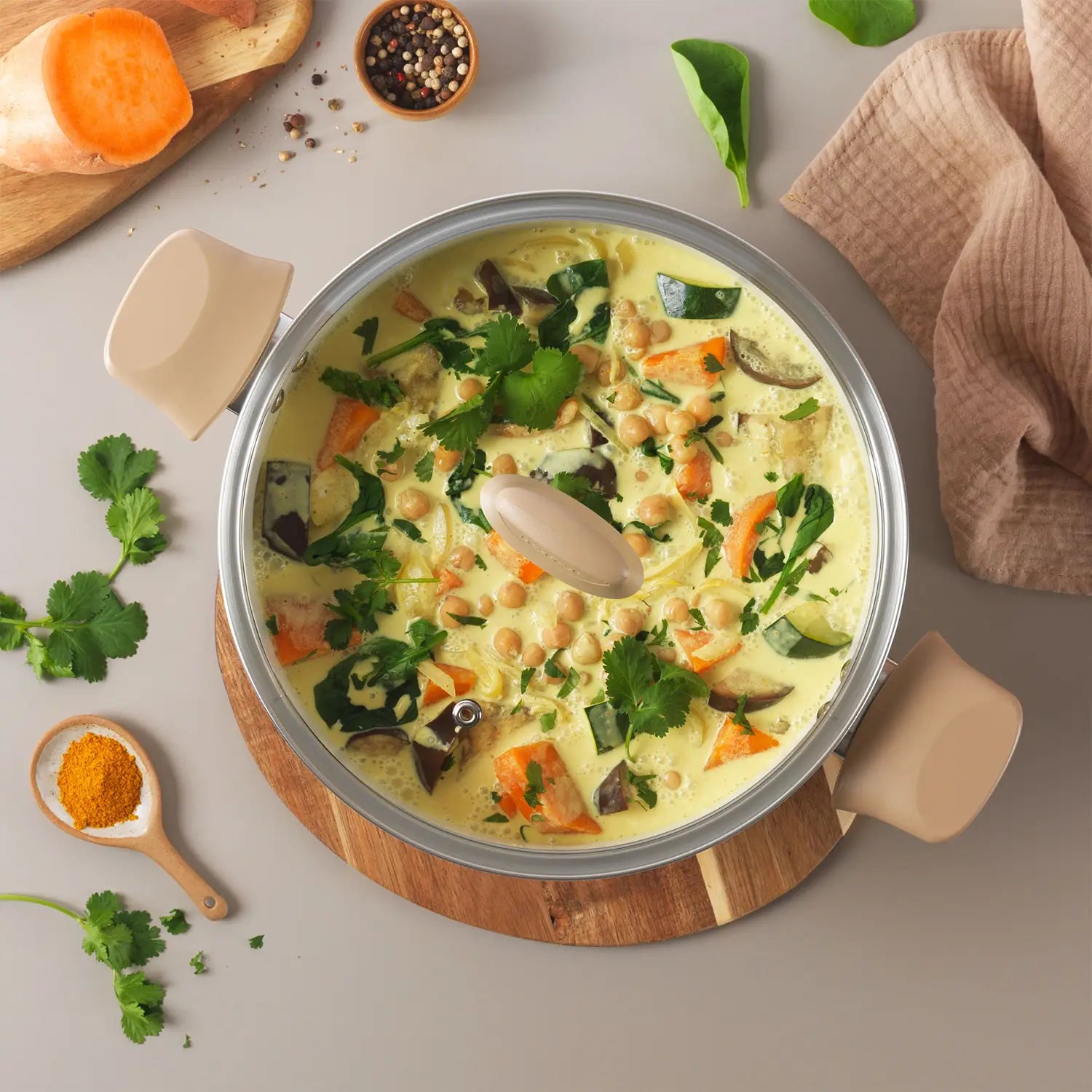 The glass lid features a steam-release vent for safe cooking that maintains the full flavour and moisture of your ingredients.