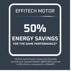 *Airflow performances measured internally, according to standard EN/IEC 60879:2019 and set to 50 m3/min, compared to VU5640F2.