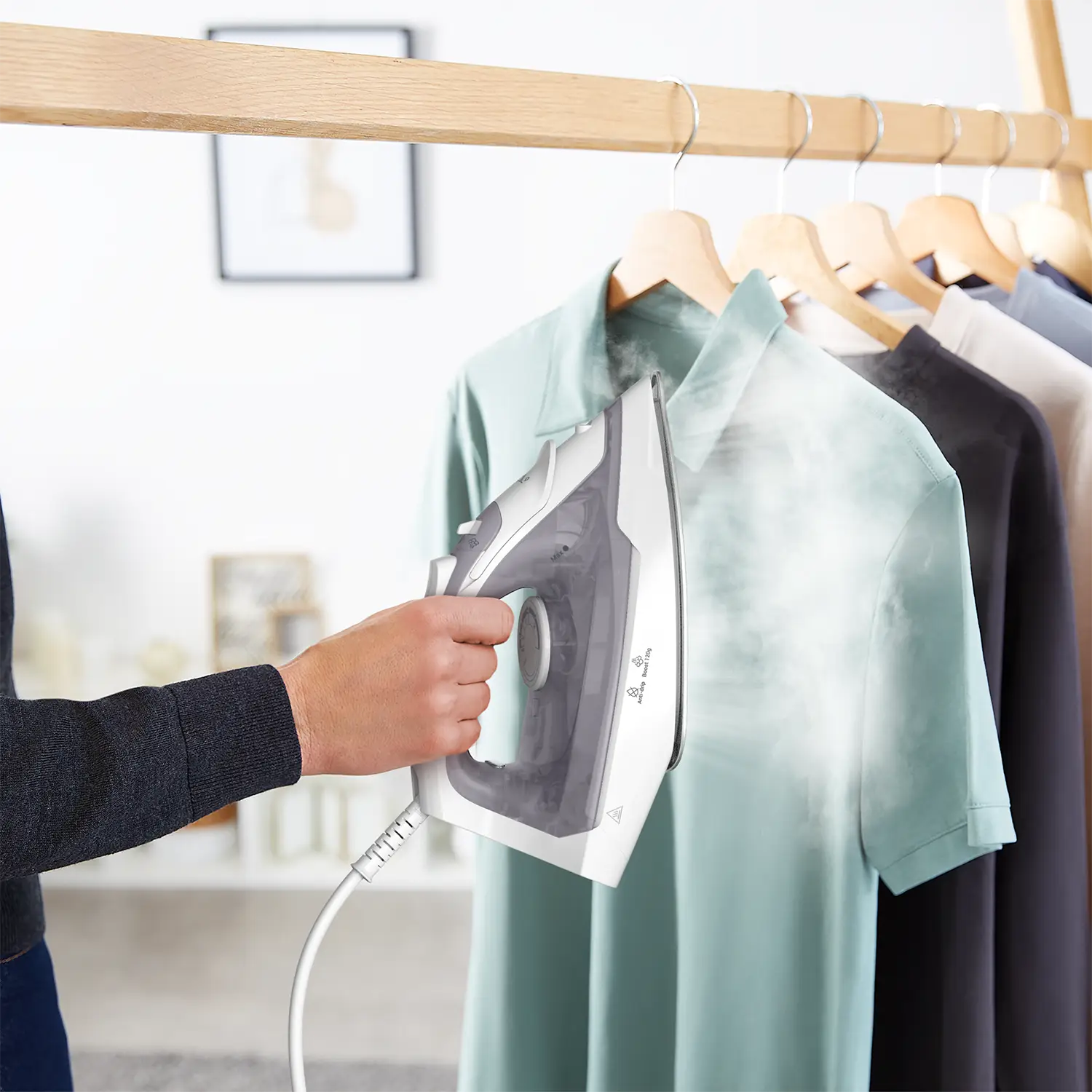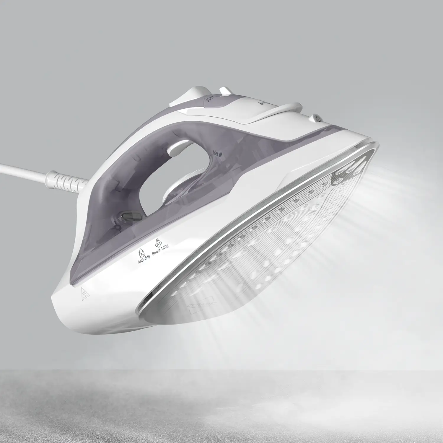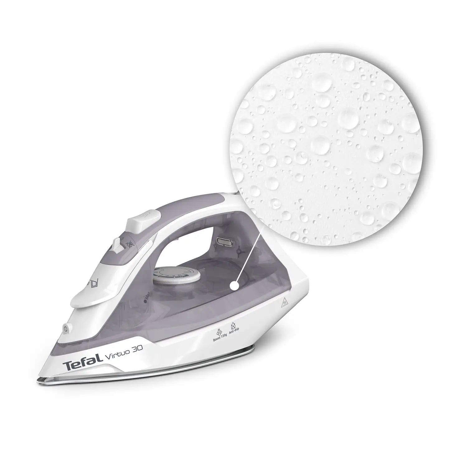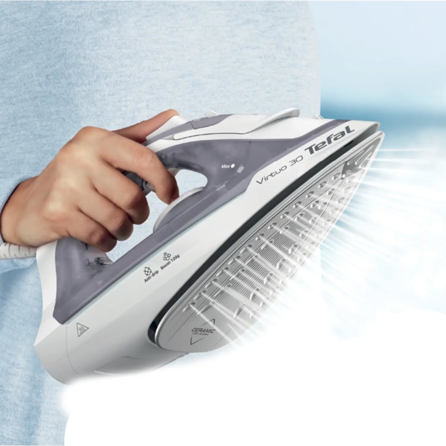 Introducing Virtuo 30, a high-performance 2000 W steam iron that delivers powerful steam for effortless results every time. Discover the perfect steam iron package for exceptional garment care: Highly efficient wrinkle removal, a fast 30-second heat-up time, high continuous steam output, a powerful steam boost, an easy-gliding ceramic soleplate, anti-drip protection, a pointed precision tip and more.